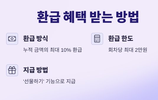 주의할 점은 환급금을 받은 후 30일 이내에 반드시 '선물하기' 기능을 통해 등록해야 한다는 것입니다. 이 기간이 지나면 환급액이 소멸되니 꼭 기억하세요!