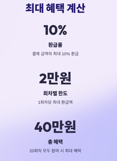 5월부터 9월까지 총 20회차 동안 진행되므로, 매주 계획적으로 쇼핑하면 총 40만원의 환급 혜택을 누릴 수 있습니다. 가족이나 친구들과 함께 이용하면 더 큰 혜택을 누릴 수 있어요.